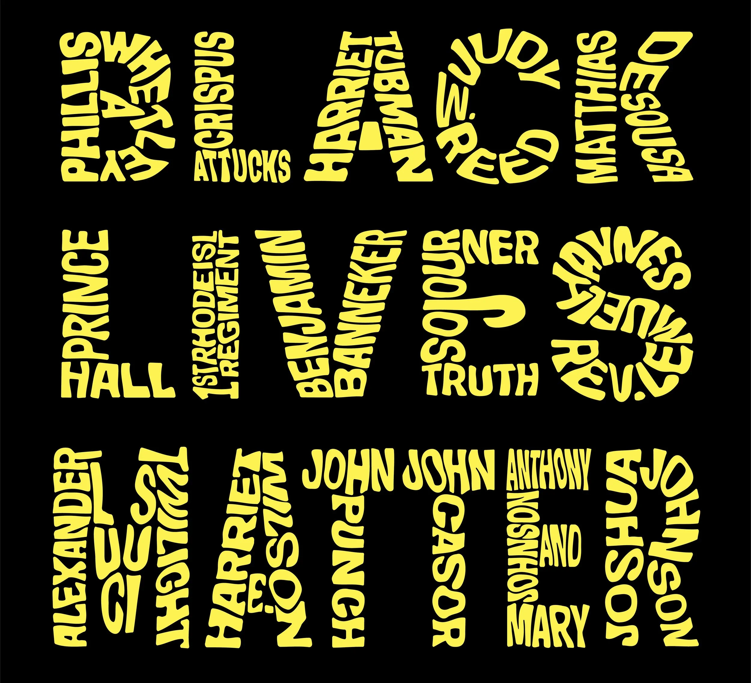 The letters are composed of names of brave and brilliant individuals of African descent who have essentially been erased from American History. They were brilliant, valiant, and major contributors to all that America’s Constitution aspires to be.