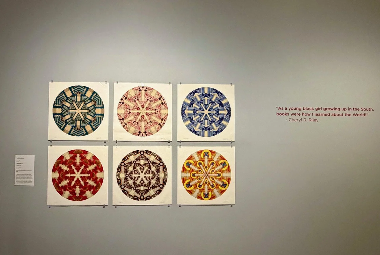 Many of you are well acquainted with my “Kaleidoscope” prints on paper. Curator Bryant Small has included them in this group exhibit because they aligned perfectly with his theme. Each kaleidoscope is a software transformation of my hand-painted glyphs, which are on the pages of a 1957 encyclopedia series. It is a matriarchal society’s language that has no word for war or murder. The quote Bryant chose now strikes me as naïve once I really read and looked at the images chosen for the pages of those encyclopedias released when I was only five years old.